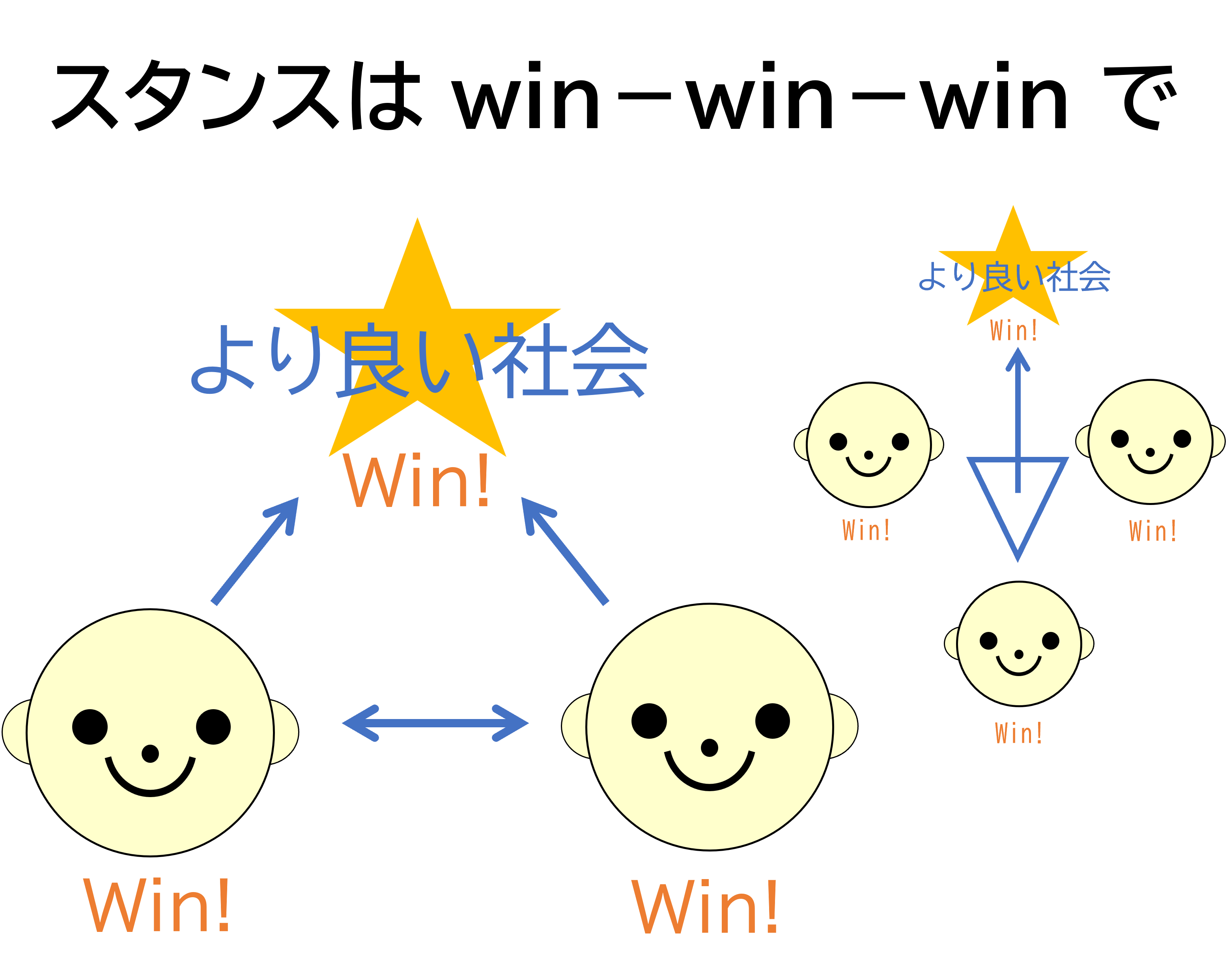 その時に大事なスタンスがwin-win-win です。目指す仲間が増えてもその構造は変わりません。