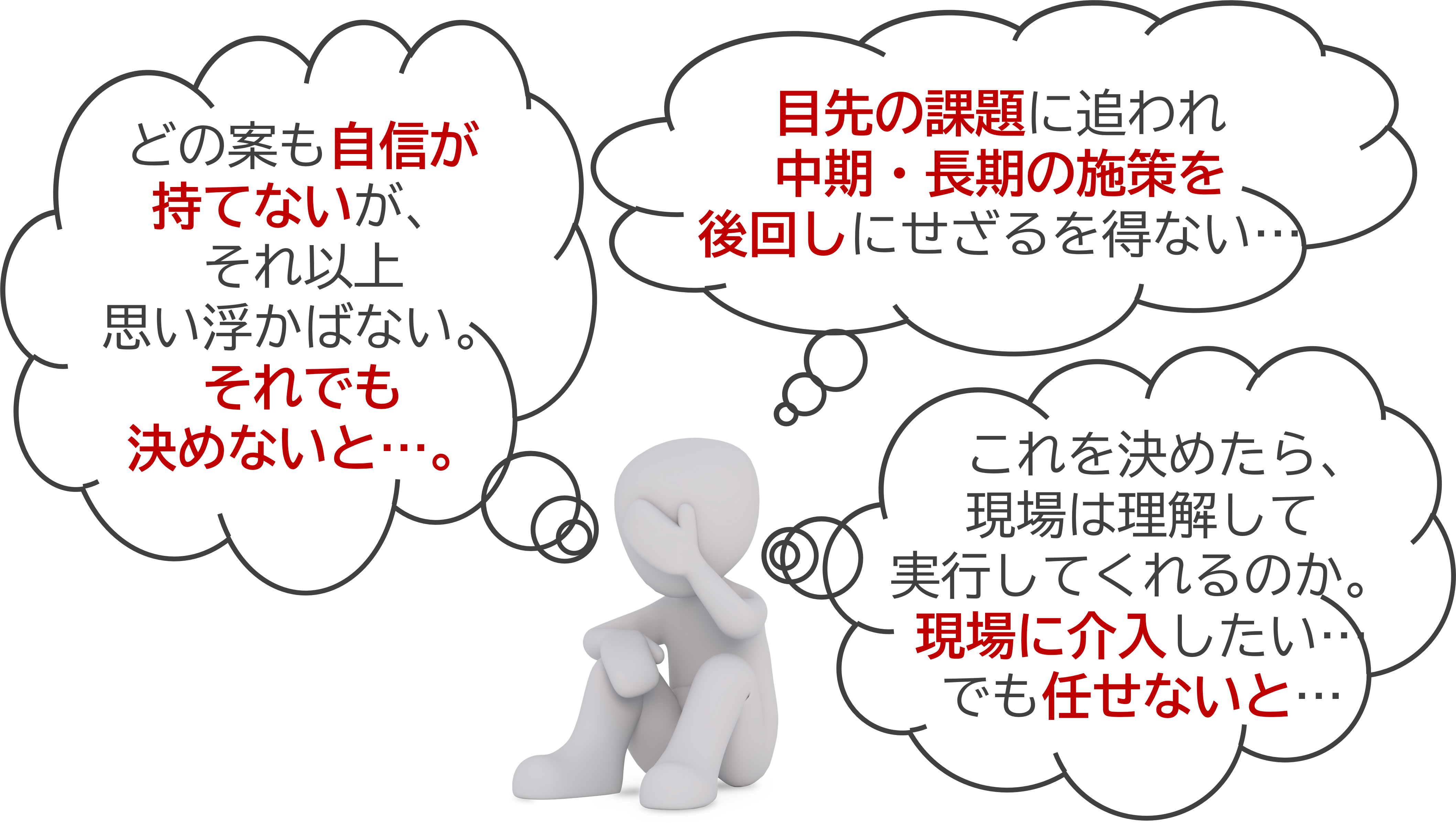 「様々な案を自分でも考え部下からも出ているが、どれも起死回生の策とは思えない。本音のところで自信が持てない。でも何かを決定しなければならない」