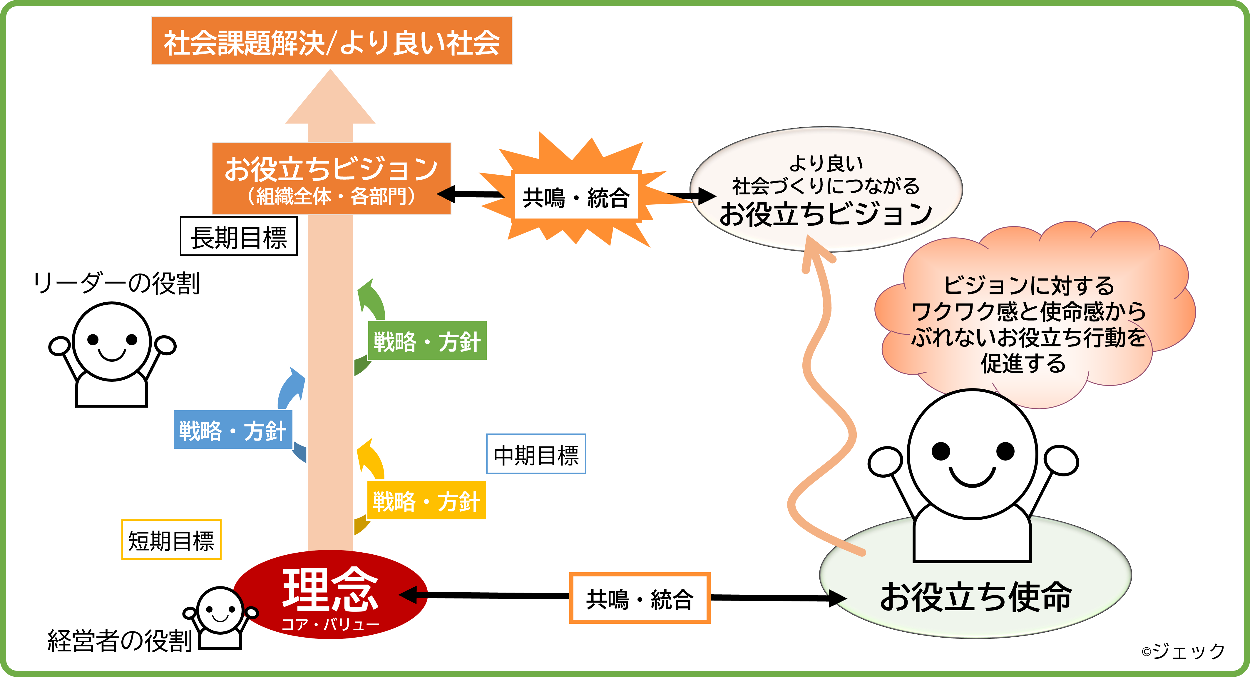 この存在意義が社員全員に浸透していると、自分のお役立ちイメージとの接点を見つけて、自ら理念の実践やお役立ちビジョン実現のために、考えて行動をするようになります。