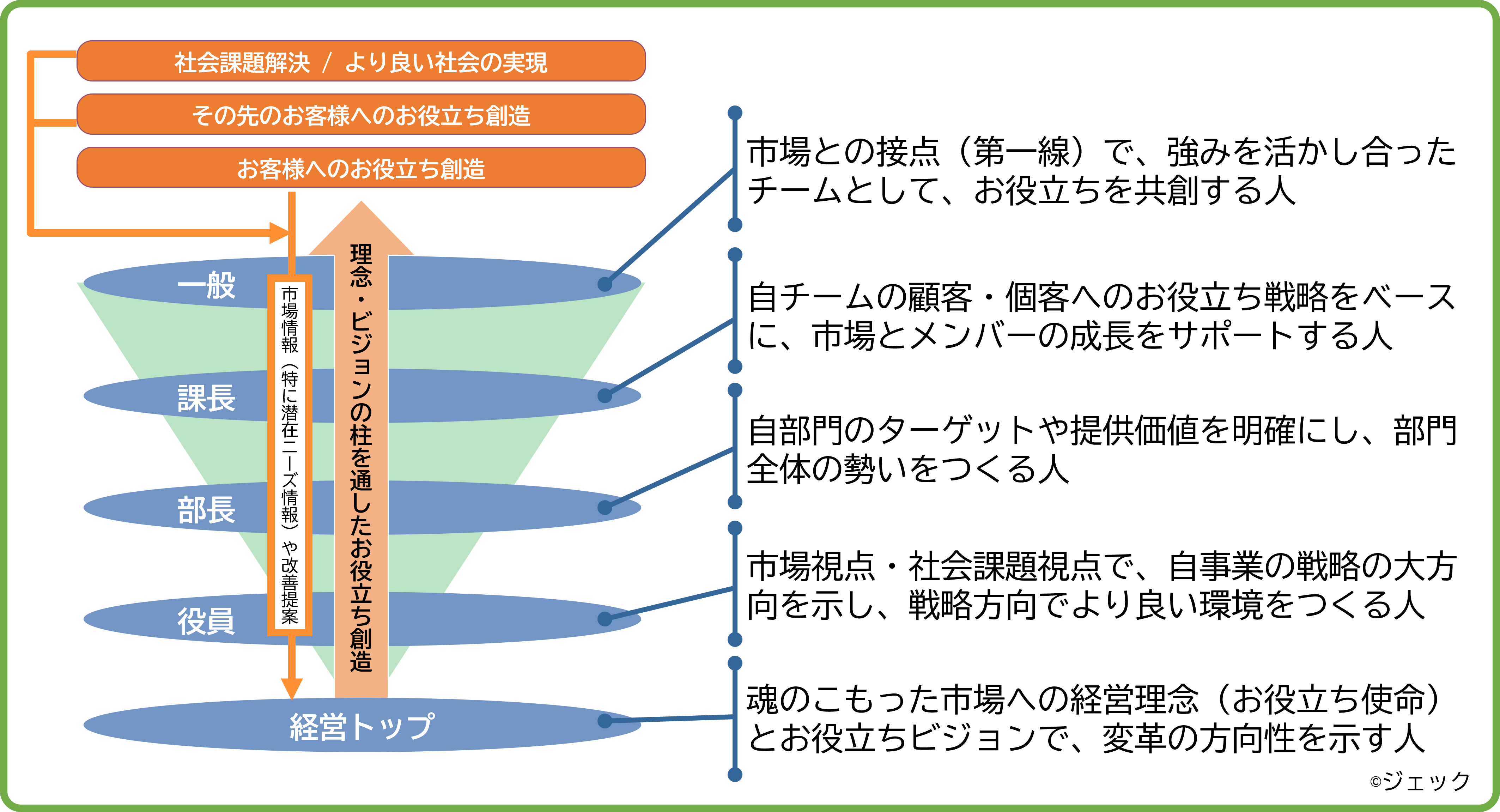 また、このように、各階層ごとに役割を明確にし、お客様や市場に近いところで戦略や戦術を決めて、お役立ちの創造を推進していくと、顧客とのエンゲージメントも高まり、組織文化も変わり、現場主導での成果が生まれてくるようになります。