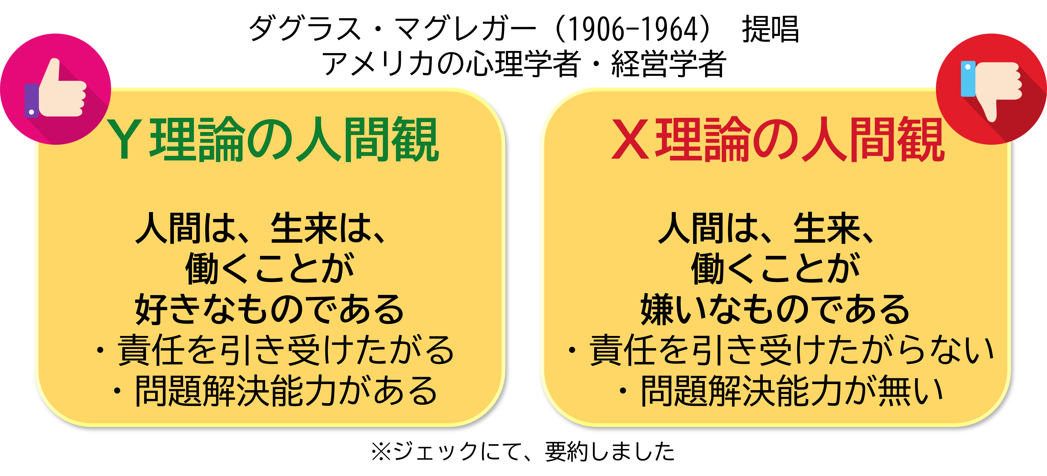 Y理論の人間観とは ダグラス・マグレガー(米経営学者、1948-1954)が提唱したもので、 「人間は生来は働くことが好きなものである」という考え方です。