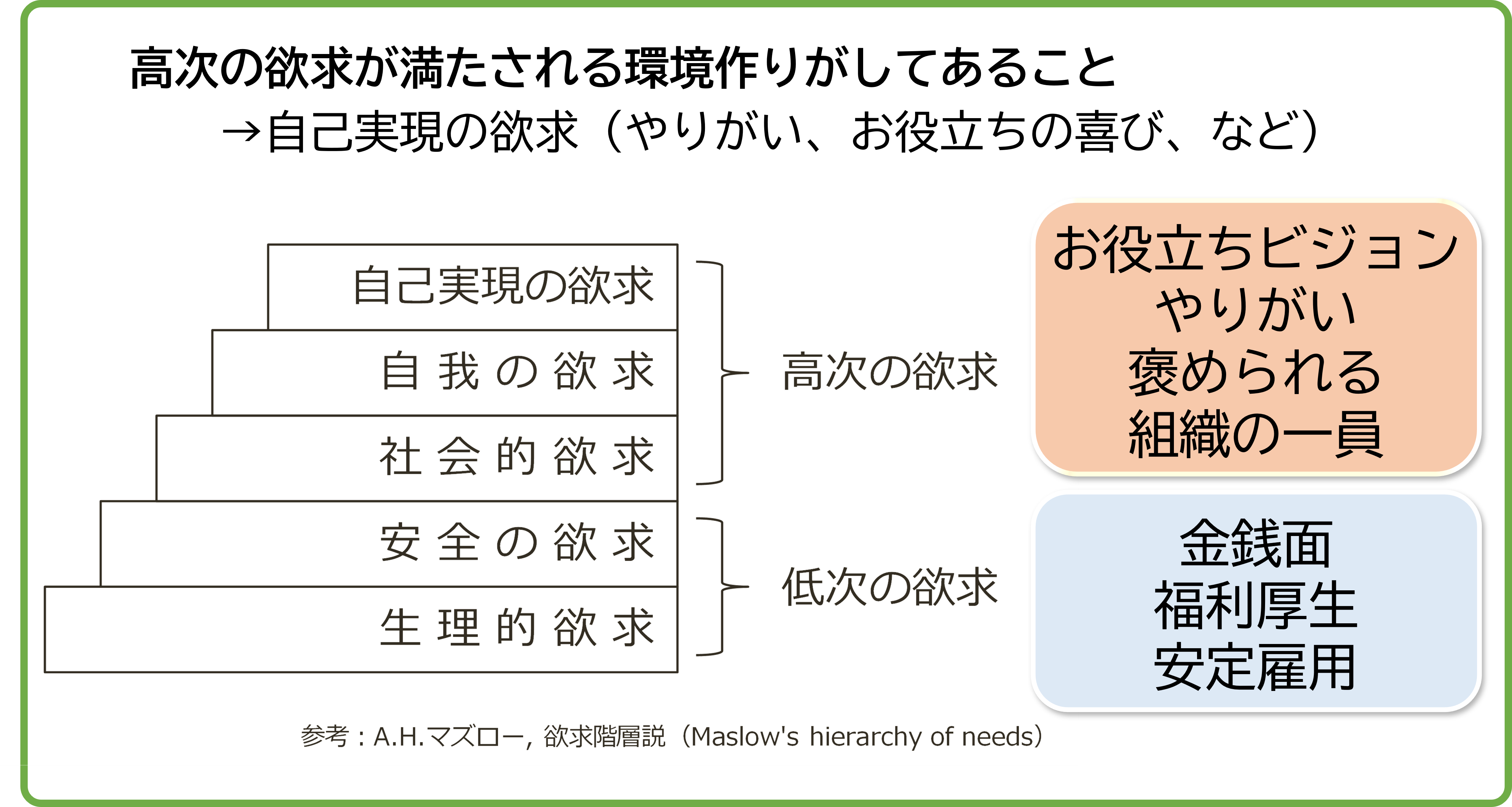 この中から「2.高次の欲求が満たされる環境作りがしてあること」について少し詳しくご紹介します。