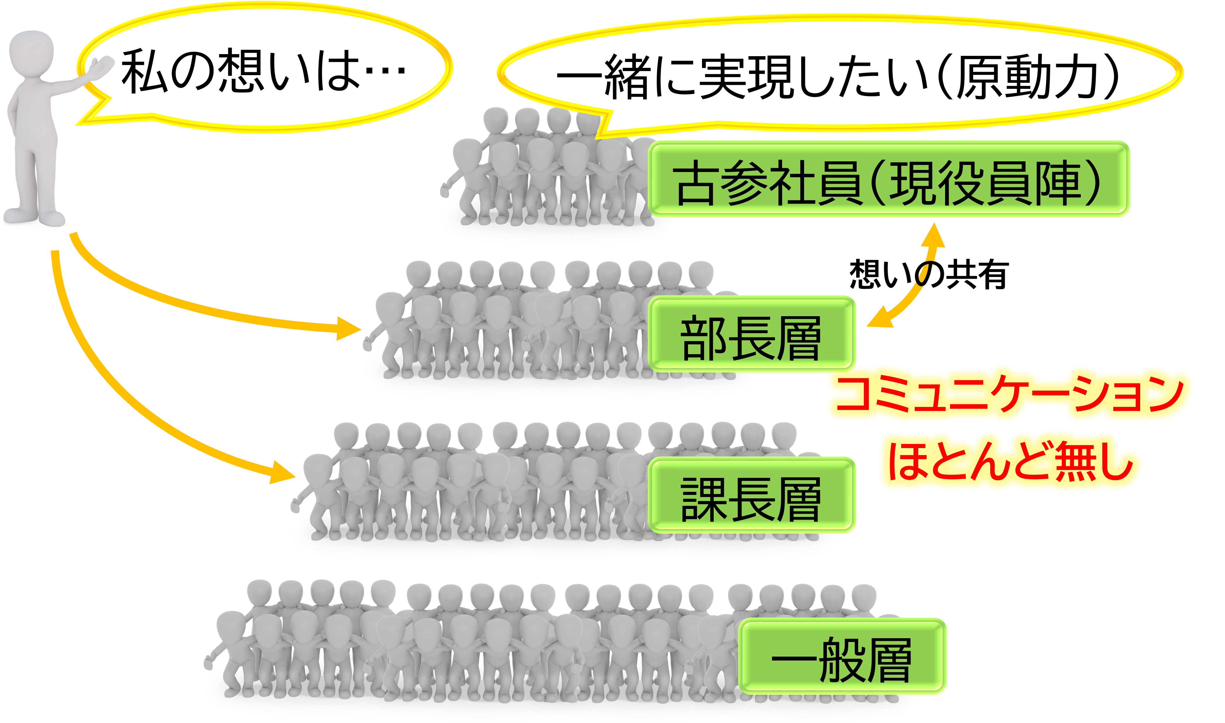 そこでわかったのは、社員数が急激に増えた頃に、創業者が第一線を退きました。そして、創業者の想いを直接聞き、この想いを実現することを原動力としてきた、我々古参の社員が幹部になりました。