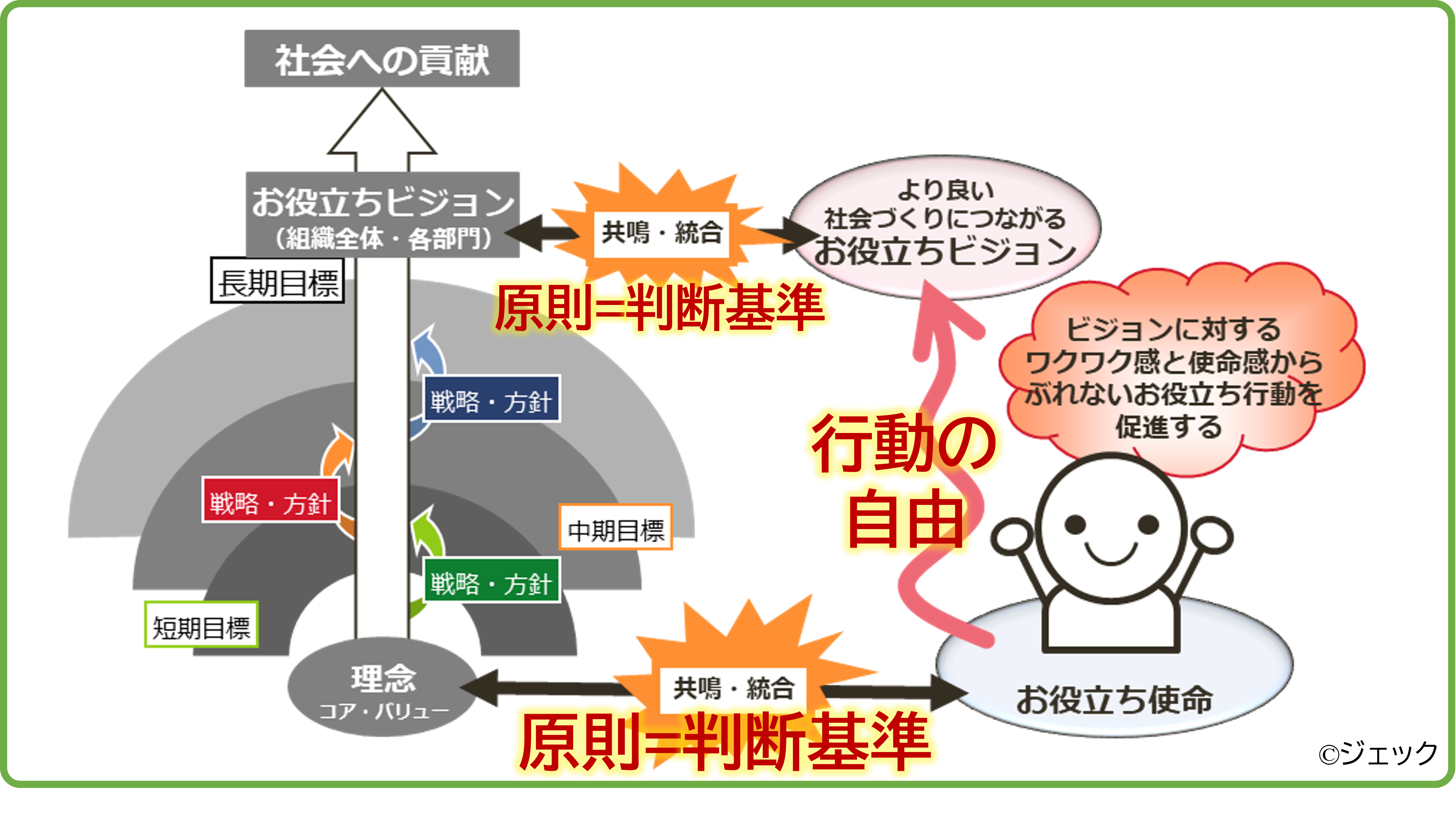 そこに、個人のお役立ち使命やビジョンと統合することで、知恵が生まれ、自発的な取り組みが増え、経営トップが考える枠をはみ出した新たな価値の創造につながります。その時に、「原則」が一致しているので、例え前例に無いことでも、組織の目的を果たすことにつながるのです。
