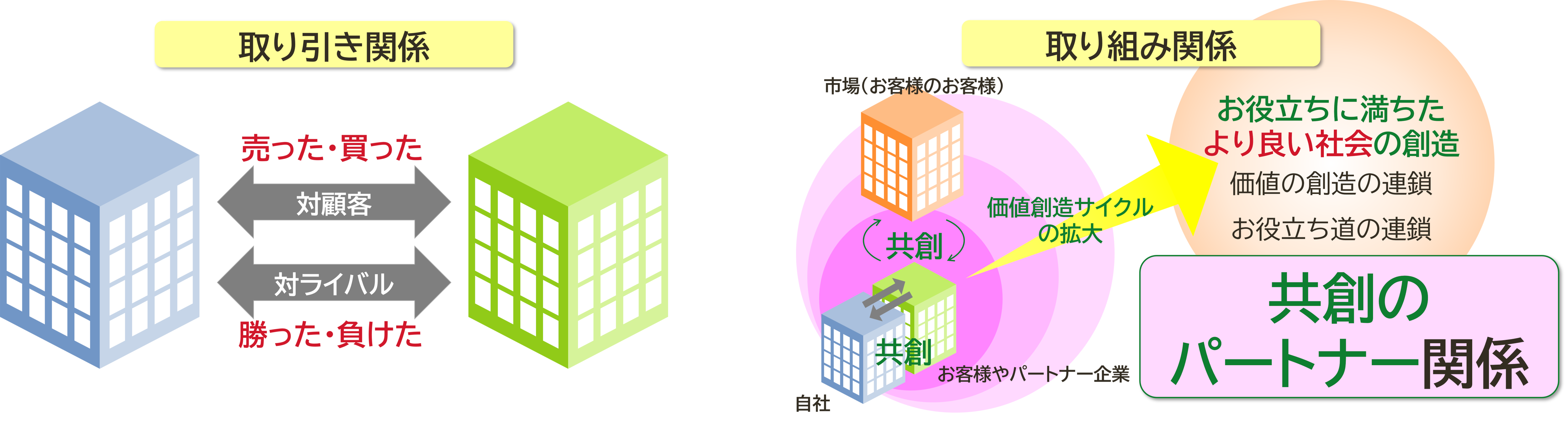 混沌とした社会情勢の中、企業は、より良い社会の実現につながる、これまでにない価値の創造が求められています。さらに、個人や個々の企業が価値の創造に腐心するのではなく、社会起点・市場起点の発想であらゆるステークホルダーと価値の共創ができる組織を目指す企業が増えています。特に顧客とは「売った・買った」の「取り引き」関係ではなく、より良い社会を共に実現する「取り組み」関係、つまり「共創のパートナー」関係が求められるのです。