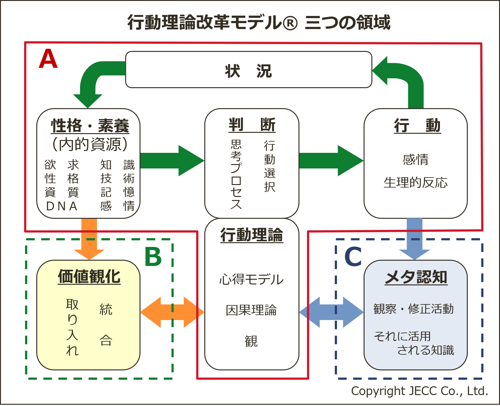 このような2種類のお役立ちについて、行動理論改革モデルのB領域にある「価値観化」から見てみましょう。B領域では以下のように述べています。